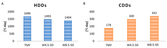 The HDD reduction was higher in the case of “business as usual” scenarios (−17%) as well as the increment of the CDDs, which was almost double compared with the current condition. The result in terms of CDD was in accordance with the expected increase in the external temperature. The comparison of the monthly mean temperatures for TMY and W8.5-50 indicated that the maximum monthly average temperature variation occurs in June. In this month, the average value of W8.5-50 is equal to 25 °C, while the average values of W4.5-50 and TMY are equal to 21.4 °C and 24.6 °C, respectively. When the daily average temperature is considered, the difference between TMY and W8.5-50 varies from 1.3 °C to 9.3 °C. The hottest month is August and, in this case, the average temperature is 26.8 °C for TMY, 29.1 °C with W45-50, and 30.1 °C with W8.5-50. In that month, considering the daily average temperature, there is a difference between TMY and W8.5-50 that varies from 1.1 °C to 3.4 °C. Moreover, the results are comparable with those obtained for other zones. For instance, Ramon et al. [50] concluded for Belgium that the HDDs will decrease by around 27% and the CDDs will increase with a factor of 2.4 in the RCP 8.5 scenario. The obtained result is also consistent with respect to the projections of [51]. They found that in southern Europe, the HDDs (considering a base temperature of 15 °C) will decrease from −30% (RCP 4.5) to −35 % (RCP 8.5); instead the CDDs (considering a base temperature of 22 °C) will increase more than 40% with the RCP 8.5 scenario.
