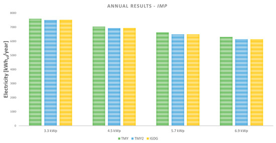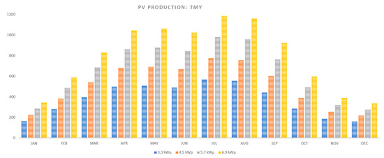 Figure 8 shows the monthly production from PV obtained with TMY for the four examined sizes. The equivalent one-diode was used in DesignBuilder. Mathematically, the PV module employs equations for an empirical equivalent circuit model (a DC current source, diode, and either one or two resistors) to predict the current-voltage characteristics of a single module. The strength of the current source is dependent on solar radiation and the characteristics of the diode are temperature-dependent.