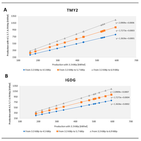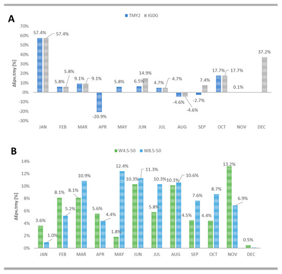 Retrofit scenario and 3.3 kWp: (A) RCP 4.5 vs. TMY; (B) RCP 8.5 vs. TMY.