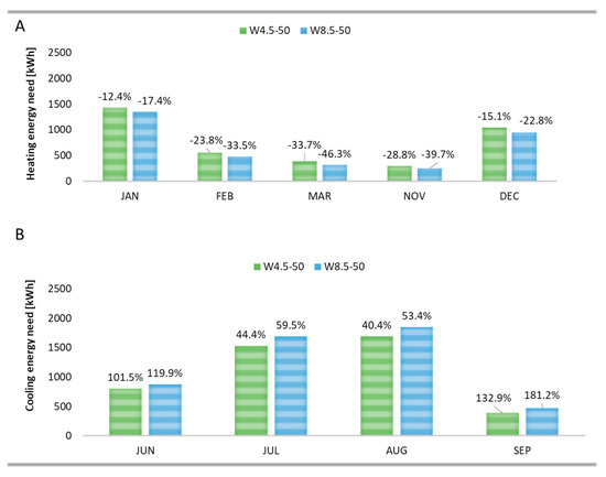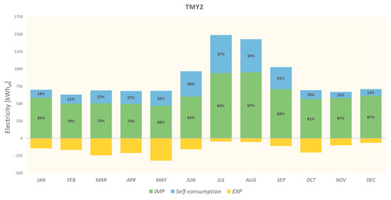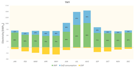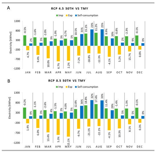 The monthly energy balances obtained with the medium-term projections are reported below for evaluating how climate change affects the energy balance of the retrofitted building. In particular, the aim of this analysis is to understand which peak power of the PV system is most suitable to allow the retrofitted building to cope with the effects of the expected climate change. The maximum and minimum values of the peak power of the PV system are taken into consideration. Starting from the case with 3.3 kWp, both for the “strong mitigation” future scenario (Figure 20A) and the “business as usual” scenario (Figure 19B), there are no important variations of the imported and self-consumed electricity in the winter and intermediate months. Furthermore, in these months, the increased PV production leads to an average percentage increase of exported electricity, equal to 7% with RCP 4.5 and 8% with RCP 8.5. Among the intermediate months, the two future scenarios show the greatest differences in May. Indeed, compared to TMY results, the exported energy shows an increase of 2% with W4.5-50 and of 16% with W8.5-50. In the months of the cooling season, in addition to the different PV production, there are the effects of changes in energy needs. Compared to the simulation with the current climate file, both the electricity imported from the electricity grid and self-consumption increase, mainly with the “business as usual” scenario. For instance, in July, the retrofitted building imports 929 kWhel (+21%) with RCP 4.5 and 983 kWhel (+28%) with RCP 8.5. The energy exported to the grid should decrease in the months of July and August. In general, the expected minimum power results in very low levels of electricity exported in all months. At the same time, the building is unable to cope with the increase of consumption in the summer months. Different conclusions can be found with the highest peak power in Figure 21. In this case, the high electricity generation from photovoltaics allows counterbalancing the imported energy since the increase in self-consumption prevails. At the same time, the energy exported to the grid in the summer months reaches acceptable values, lower than the values observed in February and March. For instance, in August, the electricity imported from the grid in the case of W4.5-50 (Figure 21A) goes from 967 kWhel with 3.3 kWp to 690 kWhel with 6.9 kWp. Therefore, imported electricity is reduced by about 29%. At the same time, with the “business as usual” scenario, the imported energy varies from about 1044 kWhel to about 729 kWhel (−30%).