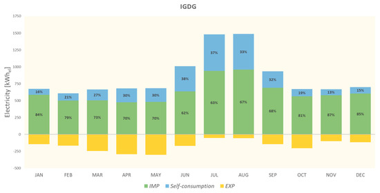 The percentage variations are referred, for each peak power, to the simulations result of the base case, with the same size of PV system. It can be observed that the percentage variations of imported and self-consumed electricity are comparable passing from the state of fact to the retrofit scenario, for each size. In August, self-consumption is reduced by 6.0% with 3.3 kWp (Figure 19A) while it is reduced by 14% with the maximum size (Figure 19D). The opposite effect is observed with electricity imported from the grid. Compared to the base case, the maximization of photovoltaics combined with the refurbishment intervention leads to a reduction of imported electricity. With the same electricity consumption, the maximum peak power increases the self-consumption in each month. For instance, in July with the minimum power of the photovoltaic system, the self-consumption is equal to 496 kWhel; it increases by 18% with 4.5 kWp, 32% with 5.7 kWp, and 41% with 6.9 kWp. Furthermore, the simultaneous reduction imported electricity and self-consumption causes the increase of the energy exported to the grid, compared to the base case. In particular, in July and August (Figure 19A), the exported energy goes from 108 kWhel to 174 kWhel (+77%) with 4.5 kWp, from 228 kWhel to 315 kWhel (+32%) with 5.7 kWp, and from 368 kWhel to 468 kWhel (+44%) with the maximum size of PV system. The highest value occurs in all cases in September which is the summer month characterized by the lowest self-consumption and by a contribution of imported energy comparable to June. In the case of the maximum power of the PV system, the electricity exported to the grid is equal to 596 kWhel, i.e., +8.4% compared to that exported in June, + 4% compared to the non-retrofitted building, and +29.3% compared to electricity exported in the same month with a 5.7 kWp photovoltaic system for the retrofitted building. It is important to remark that this analysis does not take into account the loss in the efficiency of the PV system within a service life of 30 years. However, some studies like [53] suggest that the impact of climate change on PV systems varies up to 2.5% but it could be mitigated through proactive design and the application of maintenance strategies. Thus, the proposed analysis is the first attempt to evaluate what happens to the building’s energy balance. In further research, a loss assessment curve will be implemented for the dynamic evaluation of the energy efficiency reduction both of the PV system and the building envelope components. Moreover, an economic analysis will be performed to study the incidence on the operating costs by also taking into account the maintenance and replacement.