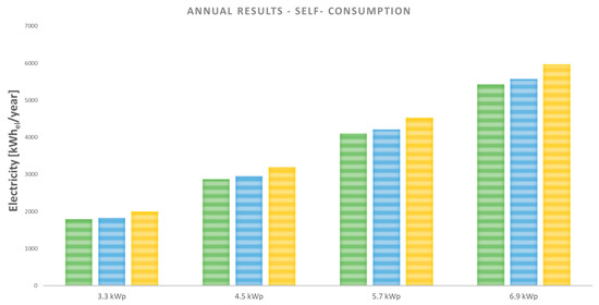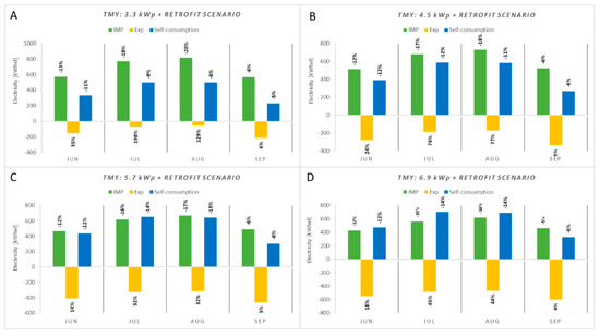 TMY—Results with retrofit scenario: (A) 3.3 kWp; (B) 4.5 kWp; (C) 5.7 kWp; and (D) 6.9 kWp.