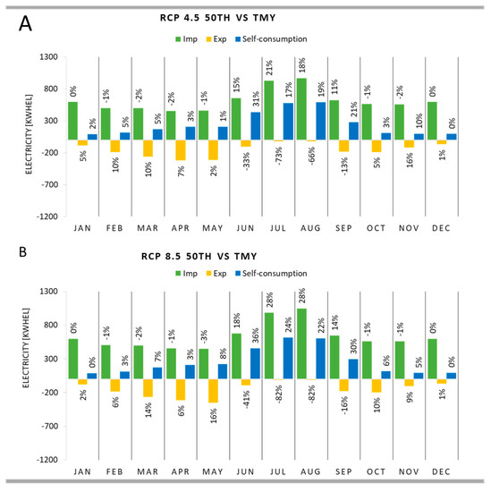 Retrofit scenario and 6.9 kWp: (A) RCP 4.5 vs. TMY; (B) RCP 8.5 vs. TMY.