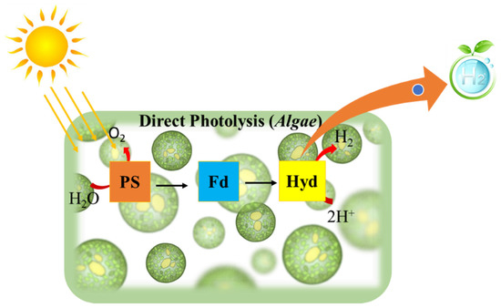 Bio-photolysis in a biological system generally means the dissociation of the water molecule in the presence of light (photons). In such a lytic process, photosynthetic microorganisms such as microalgae and cyanobacteria are involved, whereby photosystems (PSI, PSII) absorb light energy and the excited electrons pass through a sequence of energy carriers, eventually receiving two protons when a water molecule splits [28], as depicted in Figure 1.