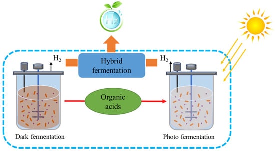 A major economic emphasis is on biological H2 production from wastewater using dark fermentation. The H2 production system has many similarities with methanogenic anaerobic digestion, notably, the two gaseous compounds that can be separated from treated wastewater. The mixed microbial population present in both bioprocesses have the same properties but exhibit one major difference in biological H2 production: bacteria such as homo-acetogens and methanogens inhibit hydrogen formation. To destroy these microbes, heat treatment is required without affecting spore-forming fermenting bacteria. Other approaches include high dilution rates or low pH for higher activity of the reactor and optimized operating environmental conditions to maximize the output of hydrogen. Unfortunately, the production of bio-H2 depends on a comparatively limited volume of the overall equal H2 present in wastewater. We cannot estimate recovery efficiency in high-carbohydrate wastewater to surpass 15% of the electron equivalent, under optimized conditions. Therefore, various researchers have performed two-step processes that involve the development of bio-H2 via methanogenic anaerobic digestion to increase the overall energy output of the process. Methanogenic anaerobic digestion, as described later, is a useful and convenient process. Another promising technique is the conversion of methane to H2 via a catalytic method. Therefore, H2 production through the direct method is somewhat limited to the pretreatment step in large-scale energy production, while the discharge of H2 gas through plastic enclosures and thin metal sheets represents another limitation because of the high diffuse rate of H2 [32]. To increase the overall hydrogen yield, hybrid processes are also suggested, whereby organic acids produced in dark fermentation can be used as a feedstock in photo fermentation to produce hydrogen (Figure 2).