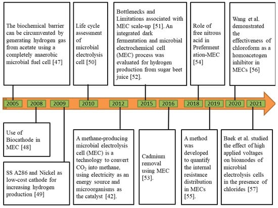 In MECs, microbes are utilized as biocatalysts to reduce the activation overpotential of a certain redox process, enhancing voltage efficiency and production rate [44]. On the surface of the anode, some microbes can develop a biofilm, which can convert the chemical energy contained in organic molecules into electrical energy. At the cathode, this electrical energy is subsequently used to produce additional useful products, such as H2 and CH4 [45]. To withstand cellular function and growth, certain microorganisms are electrochemically active, which means that they can transfer electrons along with the electrode to keep things running [46]. The chronological development of MEC technology is illustrated in Figure 3.