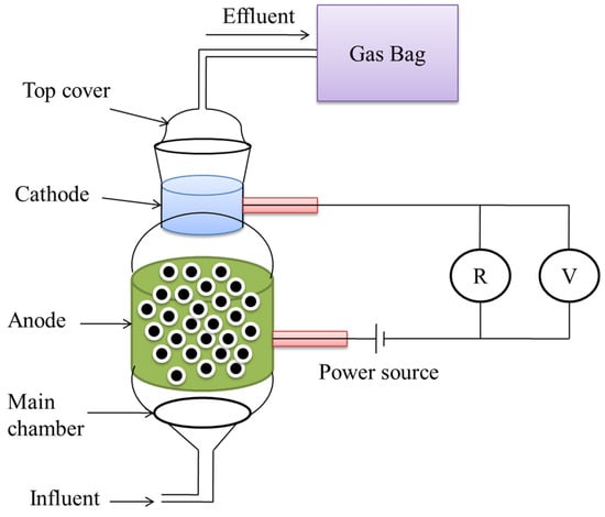 The reactor was made up of two parts: a top cover and the main chamber, both of which were constructed of glass and had a capacity of 0.4 L, as described in Figure 5 [62]. The substrate and electrolyte were pumped in via the bottom intake, and the produced gas was collected from the cathode with the use of a gasbag. HPR increased from 0.03 L·L−1·day−1 to 1.58 L·L−1·day−1 in a 24 h batch test when the applied voltage was expanded from 0.2 V to 1.0 V, and total hydrogen recoveries rose from 26.03% to 87.73% when the applied voltage was increased from 0.2 V to 1.0 V. The greatest total energy recovery was 86.78% at an applied voltage of 0.6 V [67].