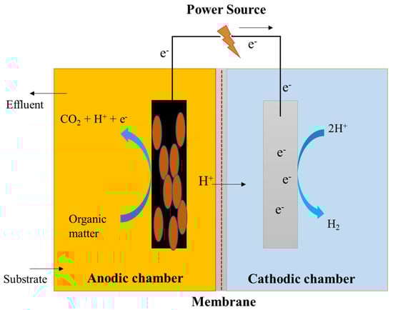 A research group put together single-chambered MECs to synthesize hydrogen and assess the process efficiency. The main design used a glass bottle with a total capacity of 50 mL, while the secondary configuration used vials made of borosilicate glass with a total capacity of 10 mL; the cells usually used a mixed culture and pure culture of S. oneidensis, respectively. The anode and cathode, measuring 3.5 × 4 cm2 and 4 × 5 cm2, were kept 2 cm apart by plastic screws. The anode was type A carbon, and the cathode was type B carbon with platinum (0.5 mg·cm−2) as a catalyst separated by a J-cloth layer to prevent a short-circuit in both configurations [63,64]. Single-chambered MECs lack a membrane, as illustrated in Figure 4. When production rates are high, the microbial conversion of hydrogen to methane will be slow, with hydrogen being relatively insoluble in water. Energy losses of the membrane are lowered in membrane-less MECs, and the energy recovery process is high [65].