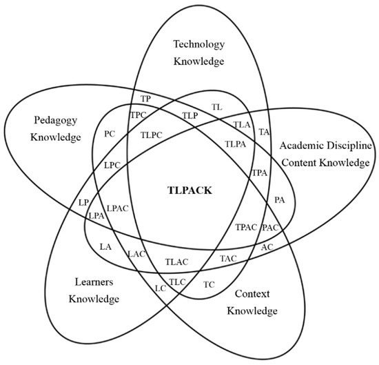 In today’s heavily digitized world, teachers’ technological pedagogical content knowledge (TPACK) is a critical component of their ability to leverage educational technology and teach effectively [12]. This is because today’s students’ communication and learning styles are dramatically influenced by the increasingly digital environment in which they were brought up [13]. However, previous studies on teachers’ TPACK predate the pandemic and have not considered later knowledge about learners and context [14,15,16]. Hsu and Chen [15] proposed to include these two factors and build the technology, learners, pedagogy, academic discipline content, and context knowledge (TLPACK) model, which is based on TPACK [8], with additional information communication technologies—technological pedagogical content knowledge (ICT-TPCK) [14], and education technology, pedagogy and didactics—academic subject-matter discipline, educational psychology and educational sociology knowledge (TPACK-XL) [16], to explore the types of knowledge that teachers at various levels should equip themselves with in detail. Scholars have advised teachers to tailor their teaching strategies to students’ characteristics [17] and suggested that these characteristics will impact online education during the COVID-19 pandemic [18]. Therefore, this study is significant because it not only assesses teachers’ TLPACK during the pandemic but also compares teachers from two groups and their TLPACK, both pre-pandemic and during the pandemic. It asks the following three research questions (RQs):