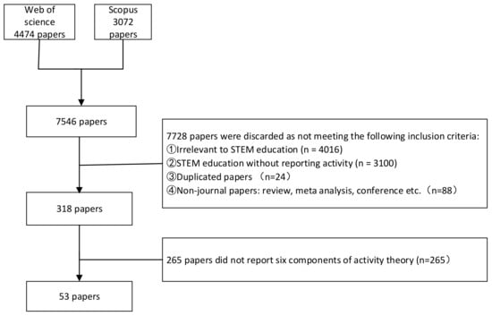 To achieve the purpose of this study, a systematic review process began with a literature search by querying Scopus and Web of Science Core Collection databases []. We limited our search to STEM education activities (search date: 2 to 28 January 2021). The keywords and connectors applied to the literature searches included “STEM AND Learning activities”, “STEM education”, and “STEM education AND Science, Technology, Engineering, and Mathematics learning activities”. The period of studies examined [] was from 2011 to 2020. A search result of 7546 papers in total was found, of which 4474 papers were retrieved from Web of Science and 3072 papers were obtained from Scopus.