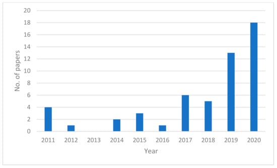 In addition, the current review included the growth rate of the 53 research papers retrieved from 2011 to 2020. To obtain the initial value and ending value for the growth rate of 10 years period, we analyzed the number of studies in first five years (2011 to 2015) and second five years (2016 to 2017) [].
