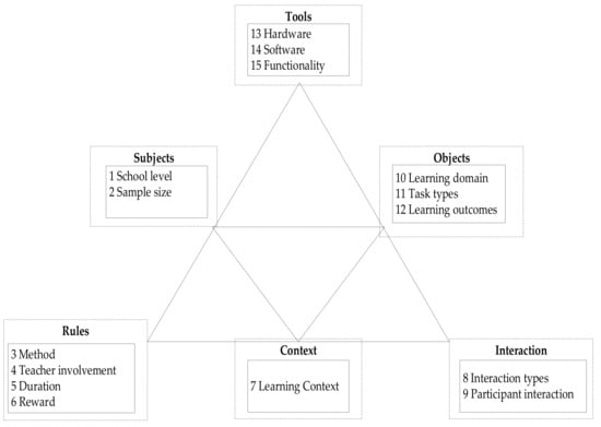 The selected 53 papers were analyzed based on the activity theory framework, which was developed as a guide for the data analysis. The activity theory framework for this study has been adopted in previous studies such as [,]. The framework was revised further to suit the purpose of this study and can be seen in Figure 3. Table 1 shows the coding scheme. The six elements included: