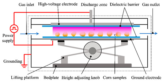 Corn, as an important part of the dietary structure of humans and animals, was chosen as a research object in this study. Chlorpyrifos and carbaryl, two insecticides frequently used to control pests in corn were selected as degradation targets. Compared with traditional technologies, plasma has been extensively studied in the field of food surface decontamination, due to its distinct advantages such as low cost, wide operating conditions, compact and flexible equipment structure, no residues, high efficiency for pollutant elimination and retention of food quality [4,5,6]. For instance, Cong et al. [7] reported that the degradation efficiency of malathion on lettuces reached 53.1% after dielectric barrier discharge (DBD) plasma treatment. Dorraki et al. [8] used DBD plasma to degrade the insecticide diazinon on the surface of cucumbers. The results indicated that the content of diazinon on the surface of cucumber was lower than the detectable value, and only a slight local burning effect was produced on the cucumber surface. In addition, Sarangapani et al. [9] investigated the effect of DBD plasma on the elimination of pesticide on blueberries and their quality changes, revealing high efficiency for pesticide degradation as well as an increase in the contents of total phenol and flavonoid without effect on color and firmness. Therefore, plasma, as a promising technology, was selected to protect corn from the pollution of pesticides in this study. In order to facilitate industrial application, air was used as the working gas. The targets of this research are to analyze the plasma treatment efficacy for the elimination of pesticides (chlorpyrifos and carbaryl) on the surface of corn as a function of the operation conditions (power, air flow rate, treatment time and frequency) and the evaluation of the treated corn quality changes as a function of exposure time.