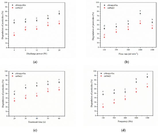 At 1000 mL·min−1 fixed air flow rate, 60 s treatment time and 1000 Hz frequency, the degradation effect of plasma on the two pesticides as a function of discharge power was investigated. As shown in Figure 2a, a significant degradation (p < 0.05) of chlorpyrifos and carbaryl could be obtained due to the increase of plasma discharge power. The degradation effect of chlorpyrifos and carbaryl reached 75.8% and 56.7%, respectively, obtaining the highest removal efficacy at a discharge power of 20 W. Besides, regardless of discharge power, a higher degradation efficiency of chlorpyrifos than carbaryl was observed under the same plasma treatment parameters.