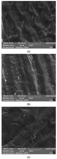 An investigation of the changes caused by air-plasma treatment of corn on the surface topography using the chosen operating parameters (1000 mL·min−1 of air flow rate, power of 20 W and frequency of 1200 Hz for 30 s and 60 s, respectively) was performed. SEM micrographs of control and treated corn samples are shown in Figure 3. It can be clearly seen that the surface of corn treated for 30 s and 60 s displayed roughness with some cracks and depressions similar to the results reported by Sarangapani et al. [21] and Thirumdas et al. [22] which were due to surface etching caused by high-energy electrons and reactive species. As the exposure time increases, the roughness on the corn surface continued to increase, as shown in Figure 3c, however, after air-plasma treatment for 30 s and 60 s, there was no significant damage and basically no change.