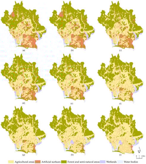 Figure 3 illustrates the nine LULC maps created for the study area, classified at the most generic thematic level.