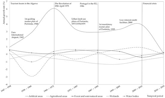 Figure 4, two main waves of urbanisation and urban growth are identified. The first phase of urbanisation occurred in the late 1960s, reflecting the tourism boom in the Algarve, which was triggered by the favourable economic situation in Europe, with the consequent increase in accommodation capacity and the construction of Faro International Airport (1965). The spurt in the increase of artificial surfaces that occurred in this first phase was also prompted by the population growth and economic activity expansion since the independence movements in Portugal’s African colonies in 1975. Although the rhythm of change has decreased after that period, urban growth continued at high annual growth rates between 1972 and 2000. The second phase of urbanisation took place in the 2000s and is represented by the fast urban growth supported by low-interest credit facilities, mainly along the coast and the construction of public and sport infrastructures (e.g., road network, the Algarve International Circuit) towards the north of the study area. Due to the socioeconomic and political development of Portugal and the Algarve region, Portimão has a complex spatial organisation and its artificial surfaces have increased greatly during the overall time span and are changing very quickly. In 1947, the total area of artificial surfaces was 384 hectares, while in 2018, the total area of that same land category had risen to 2524 hectares, so that artificial surfaces increased by 557% between 1947 and 2018. Moreover, the decreasing trend in agricultural areas, vegetation cover, and wetlands reveals the unbalanced spatiotemporal pattern of land-cover change in Portimão and, therefore, indicates that the study area has been moving towards an unsustainable path.