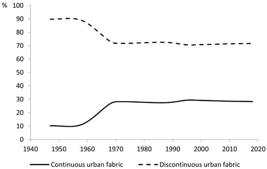 Appendix A) that discontinuous urban fabric was dominant over the 71-year study period. Between the late 1940s and 2018, on average, 76% of all new residential areas were discontinuous. The dynamic of residential areas during the study period reveals two key characteristics of these areas. On the one hand, it shows a trend towards the growth of less intensive residential areas, and on the other hand, the rapid growth rhythm of discontinuous urban fabric is a clear evidence of urban sprawl. This observation can be supported by analysing and combining population data with the previously explored land-use data.