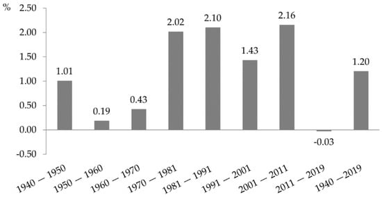 Figure 4 also reveal that agricultural and forest/seminatural land exhibited different change trends. Agricultural areas decreased at moderate negative growth rates—especially in the periods of 1987–1995 and 1995–2000 (with annual growth rates of −1.25% and −1.30%, respectively)—although the rhythm of change slowed down at the end of the study period (