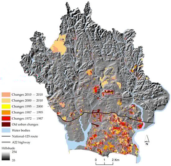 Figure 8. The analysis of this map confirms a massive growth in artificial surfaces near the main urban settlements and along the coastal area, but most importantly it reveals the dispersed urban growth over time beyond the national-125 route, which had functioned as Portimão’s northern city boundary for a long time, and the A22 highway network built in 2001. In the early study periods, this urban development did not occur beyond those physical barriers, which is quite different from what is taking place currently.