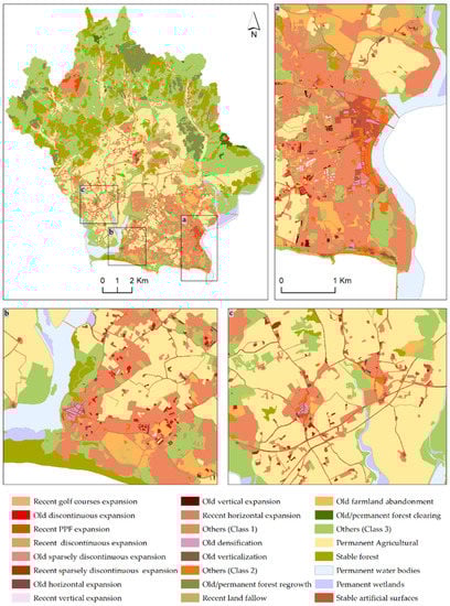 Figure 9 shows the emergent spatial patterns of those LULC change trajectories. Results of the LULC change trajectories aggregated at the class level are presented in
