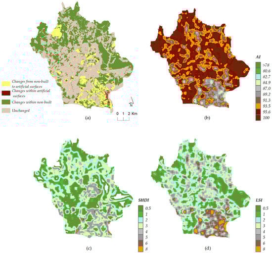 Figure 10b–d. AI, LSI, and SHDI were applied to interpret the general spatial patterns of all LULC change trajectories aggregated at the class level (
