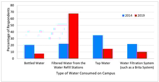 Percentage of surveyed students that selected each option when asked “What kind of water do you mostly drink while on campus?” in 2014 and 2019.