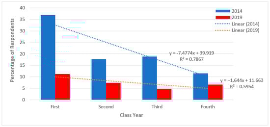 Comparison between responses to the question “What type of water do you most commonly consume while on campus” when asked in 2014 versus 2019. The data is the percentage of respondents from the total respondents of each class year that identified bottled water as their main source of drinking water.