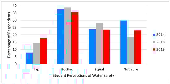 Comparison of student perceptions, by year, on the safety of tap water versus bottled water.
