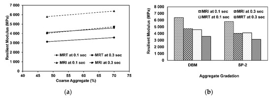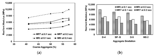 - Relation of coarse aggregate proportion versus instantaneous and total resilient moduli (i.e., MRI and MRT).