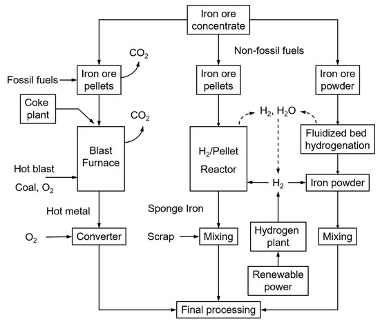 - Patisson, F.; Mirgaux, O. Hydrogen Ironmaking: How It Works. Metals 2020, 10, 922. [Google Scholar] [CrossRef]