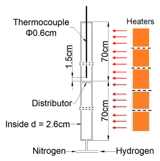 Isothermal conversions under the H2 feed were determined by a macro-thermogravimetric analyzer (electrically-heated macro-TGA), where the weight loss under the H2 feed was monitored, according to the method described by Fernandez et al. [30]. The set-up is illustrated in Figure 5. The total heating capacity is 8 kW, and the heating rate is controlled by the thermocouple installed in the Fe2O3 ore bed.