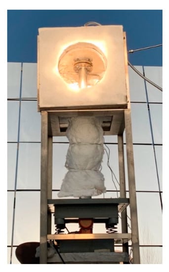 Solar H2 reductions were carried out in the solar thermal furnace, depicted in Figure 6. The maximum heat load in the cavity was ~20 kW. The vibrating fluidized bed was installed inside the 0.5 m × 0.5 m × 0.5 m cavity with an irradiation opening of 0.3 m diameter. Since we had to treat cohesive particles, a vibrating fluidized bed was used. The solar irradiation was collected by a heliostat and focused onto the cavity opening by a parabolic concentrator. The heat load could be controlled by partly defocusing the heliostat. A photograph of the experimental rig in operating conditions is shown in Figure 7.
