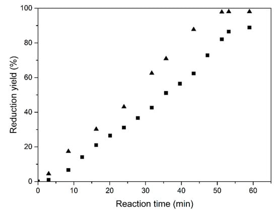 Figure 9 shows the reduction yield for the vibrated fluidized bed operation. Under the specific conditions of the test, the reaction time was about 50 min for a maximum reduction yield of about 90%. Increasing the vibration frequency to 47 Hz improved the reaction, and yields close to 98% were achieved. The superficial H2 velocity was 0.01 m/s.