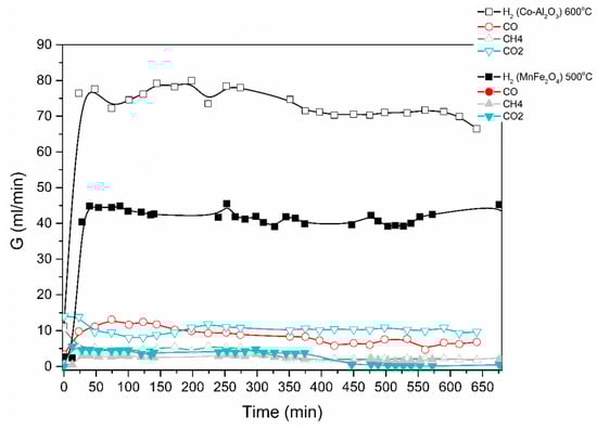 Catalytic decomposition of ethanol-water (1:6) mixture using Co-Al2O3 or MnFe2O4 catalyst. Results obtained in the electric furnace at the given temperatures.