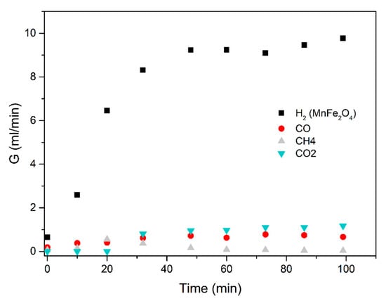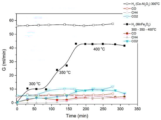Methanol-water (1:3 mixture) using the MnFe2O4 catalyst. Results obtained in the electric furnace at 300 °C.