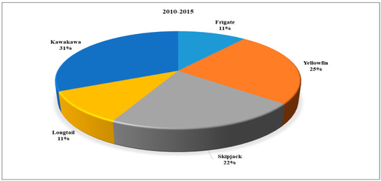 Different species of tuna are distributed widely all around the globe but are specifically found from temperate to tropical waters around the equator between 45 degrees North and South. The species are widely divided into neritic, coastal and marine tunas. Taxonomically tuna’s are grouped into the Scrombridae family, approximately consisting of fifty species, constitute the third-largest international seafood trade commodity and accounting for almost 10% of total value trade [9]. Tuna catches continued to rise, hitting their highest level at about 7.9 million tons in 2018, which was possibly due to catches from the Central and Western Pacific [9]. Within the species group, the highest catch was dominated by yellowfin tuna and skipjack tuna (58%) [4]. Globally, there are many species of tuna that are under continuous threat, as the World Conservation Union (IUCN) has declared the Atlantic bluefin tuna and southern bluefin tuna as critically threatened [10]. The recent stock status of tuna as per IOTC revealed that for albacore, the longline-susceptible biomass has decreased to about 50 percent of its 1980–1982 levels [11]. There were 20 years of moderate fishing prior to 1980, after which total albacore tssuna catches in the Indian Ocean more than doubled in subsequent years. Some fleet catches have also increased significantly since 2007, despite significant ambiguity about the accuracy of the catch estimates (e.g., Indonesian and Taiwanese longline fisheries in China) [11]. For the Indian Ocean’s bigeye tuna, there has been steep decline in longline efforts, particularly from the Japanese, Taiwanese and Republic of Korea longline fleets, which lowered the pressure on the bigeye stock since 2007 [12]. However, a recent increase in catch from purse seine fleets has intensified this pressure, and the stock is now considered overfished. Similarly, for skipjack tuna, total catches in 2018 were 30% higher than the resulting skipjack catch limit for the period 2018–2020 (470,029 t), raising concerns [11]. It is worth noting that achieving the management goals outlined in Resolution 16/02 necessitates the successful implementation of the skipjack HCR’s capture limitations [11]. Skipjack can adjust rapidly to ambient foraging conditions driven by ocean productivity, which appears to have been favorable in recent years due to its unique life history characteristics. In order to restore the overfished stocks, effective management and regulations of harvest control should be maintained at sustainable levels. Tuna fishery is fully established in the Indian Ocean, with many coastal countries involved in the fishery sector. Out of the five major tuna species caught in the Indian Ocean from 2010–2015, kawakawa constituted about 31% of the total catch, yellowfin 25%, skipjack 22% and longtail and frigate constituted 11% each (Figure 1). However, declines have occurred in most of these fishing resources due to heavy fishing pressure [13]. These declines are putting the supply of fishery products at risk [14,15], despite restrictions on some fishing activities, which include regulations on nets used, seasons and fishing areas, limitations on mesh size, etc. [16,17]. Ludwig [18] stated that the major hurdles in effective fisheries management are the negligence of scientific procedures and the actual known status of the stock under exploitation.