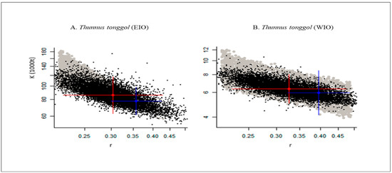 Viable r–K pairs of longtail tuna (Thunnus tonggol) in Eastern Indian Ocean (EIO) (A) and longtail tuna (Thunnus tonggol) in Western Indian Ocean (WIO) (B) obtained from the CMSY (gray) and the BSM (black) methods. The most reliable r–K pair and its approximate 95% confidence limits are indicated by a black cross for the CMSY method (A,B); for the BSM method, the corresponding cross is gray (B).