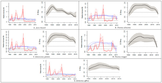 The estimated biomass of five tuna species for the Eastern Indian Ocean has been depicted in Figure 3. As shown in Figure 3A–E, all the fish stocks were subjected to continuous overfishing. Yellowfin tuna and skipjack tuna showed a similar pattern in their biomass estimation (Figure 3B,C). It is revealed that the actual relative biomass (B/BMSY) observed for yellowfin tuna was 0.82 and for skipjack tuna was 0.63. Similarly, longtail tuna and kawakawa (Figure 3D,E) had related patterns in biomass estimation with better relative biomass reaching up to 0.81–0.83, respectively (Table 5). Of all the stocks, frigate tuna (Figure 3A) had the least B/BMSY of 0.55 and was overfished, with a substantial decrease in the stock since 1995.
