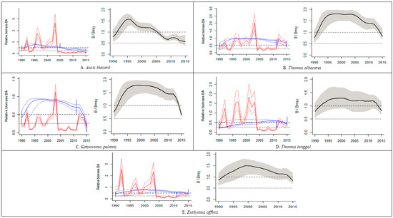 Estimated biomass and the development of relative biomass of 5 stocks assessed in Eastern Indian Ocean (A–E in BSM and CMSY). Estimated biomass trajectories (left panels) (bold dashed line) and catch (bold solid line), with the 95% confidence limits (dashed lines) and vertical lines representing the prior biomass ranges. The trajectories of relative total biomass (B/BMSY) are shown (right panel), with the gray areas indicating uncertainty.