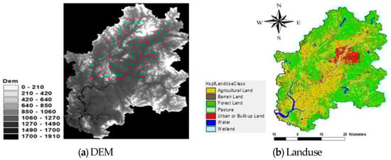Input data for the Hydrological Simulation Program—Fortran (HSPF) model and the model construction results. (a) Input digital elevation model (DEM), (b) input land use map, (c) input watershed and stream map, and (d) model output.