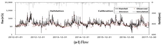The flow and water quality were calibrated and validated by collecting the data of the monitoring network (water environment information system) and the flow and water quality monitoring stations (WAMIS) for four major locations among the eight medium-sized sub-areas. Table 6 shows the parameters applied during the calibration and validation of the flow and water quality. Parameter calibration and validation were performed by comparing the simulated and measured values, as shown in Figure 3.