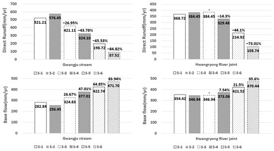 Gwangju Stream exhibited a direct runoff reduction effect of up to 85% and the Hwangryong River Joint exhibited a direct runoff reduction effect of up to 73%, respectively. The base flow was found to increase by 84% in scenario S6. The nonpoint source load was reduced by up to 78% and 54% for Gwangju Stream and by 35% for the Hwangryong River Joint. This is because the impervious area was changed to a pervious area under scenarios S3 to S6 and thus more rainfall penetrated into the soil during the rainy season. It also appears to be because the water that penetrated underground slowly flowed into the rivers in the form of base flow throughout the year.