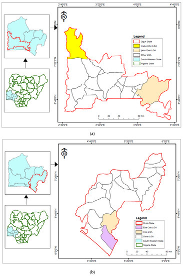 (a): Ogun State showing Imeko Afon and Ijebu East LGAs; (b): Ondo State showing Irele and Ese Odo LGAs; (c): Oyo State showing Iseyin and Iddo LGAs. Insert of Nigeria States and southwestern States.