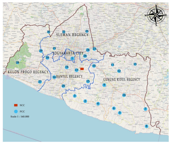 Yogyakarta, one of the provinces in Indonesia, is located on Java Island and has an area of 3178.79 km2. It has a municipality and four regencies: Yogyakarta city and Gunung Kidul, Bantul, Sleman, and Kulon Progo regencies, with respective areas of 32.5, 1485.36, 506.85, 574.82, and 579.26 km2. These areas contain 14, 18, 17, 17, and 12 districts, respectively [70], as indicated in Appendix A, for a total of 78 districts. These districts were used as candidates for primary collection centers (PCCs) in this study. The parameters used as input in the mathematical model include the distance between the PCCs, the distance expected by consumers, and the distance from PCC to SCC.