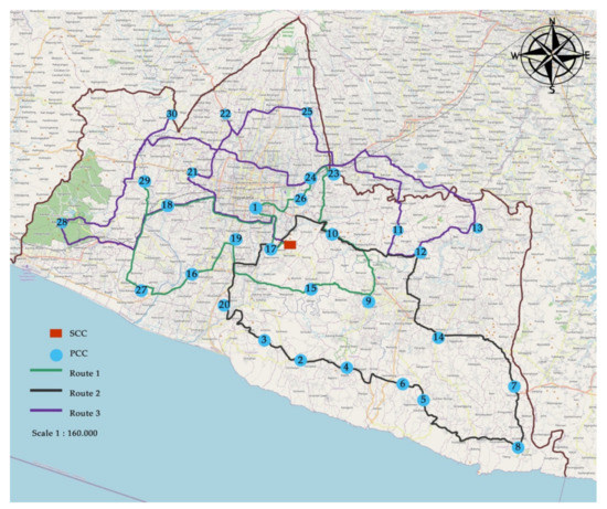 Yogyakarta Province currently has 3 locations serving as final disposal sites (TPAs). The first is the Regional TPA, commonly called Piyungan TPA in Ngablak, Sitimulyo Village, Piyungan District, Bantul Regency. It is an integrated waste disposal site created to serve Yogyakarta City, Bantul Regency, and Sleman Regency [71]. The second location is Wonosari TPA in Wukirsari, Baleharjo, Wonosari, Gunung Kidul Regency, and the third is the Banyuroto TPA in Dlingo, Banyuroto, Nanggulan, Kulon Progo Regency. The Piyungan TPA has the largest capacity and most strategic location among the three, and this makes it suitable to be used as the secondary collection center (SCC). The candidates for the PCCs are district offices, which means the distances between PCCs are the same as those between district offices, and the distance from the PCC to SCC is the distance from the district office to the TPA Piyungan.