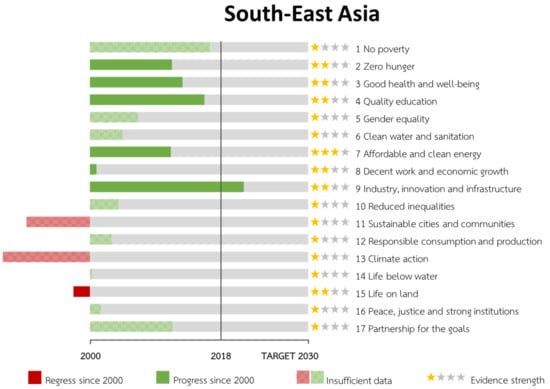 At the regional level, a report from UNESCAP [] indicates that the Southeast Asian countries anticipate somewhat satisfactory SDGs progress with certain accelerated indicators, however, certain indicators go in the reversed order with inadequate supported data. Figure 2 depicts a progress dashboard of the UN SDGs in the ASEAN region [].