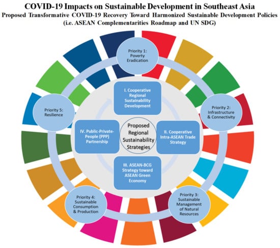 In conclusion, our analytical study demonstrates that all four proposed regional sustainability strategies can be strategically linked with the five priority areas of the ASEAN Complementarities Agenda (i.e., (1) poverty eradication, (2) infrastructure and connectivity, (3) sustainable management of natural resources, (4) sustainable consumption and production, and (5) resilience). The regional agenda is purposefully corresponded to and harmonized with the global goals of the UN SDGs for sustainable development. We also exhibit how the proposed regional sustainability strategies and all suggested sustainability domains are strategically interrelated, as aforementioned and illustrated in Figure 4. Figure 4 depicts an infographic summary of the strategic links among the proposed regional sustainability strategies for transformative COVID-19 directions and policy implications toward the harmonized international sustainability policies (i.e., ASEAN Complementarities Roadmap and UN SDGs).