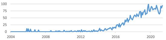 Figure 1 shows the level of interest in searches compared to the highest point of the graph based on a specific area and search period (when the frequency of search is the highest, the value of the graph is marked as 100, whereas the search word with half the highest frequency is marked as 50. Source: Google Trends [1] (accessed on 20 May 2021)).