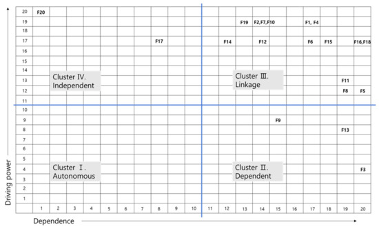MICMAC refers to “Matrice d’Impacts Croisés Multiplication Appliquée a un Classement,” which implies cross-impact matrix multiplication applied to classification [25]. One of the main objectives of this analysis is to investigate and classify the factors of interest in terms of driving power and dependence, wherein all the variables are classified into four clusters with the following characteristics [9,26].